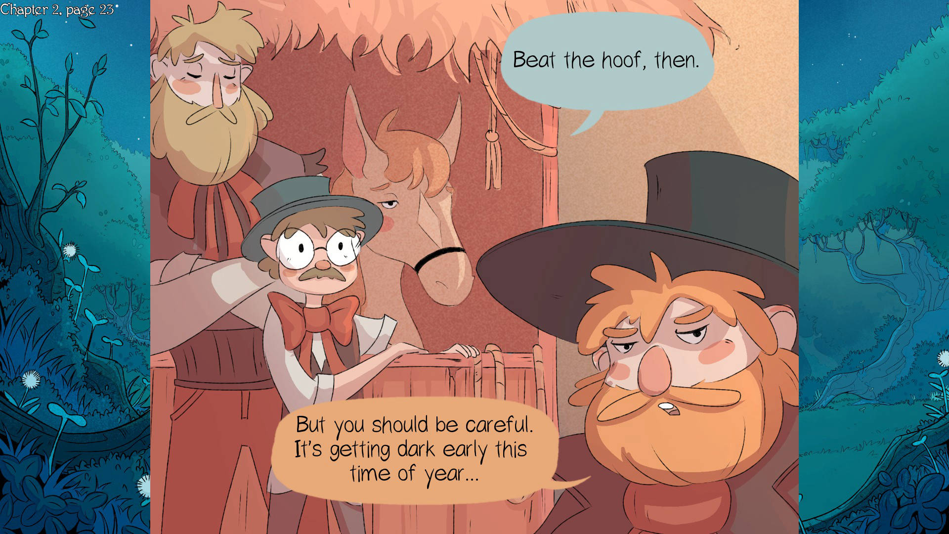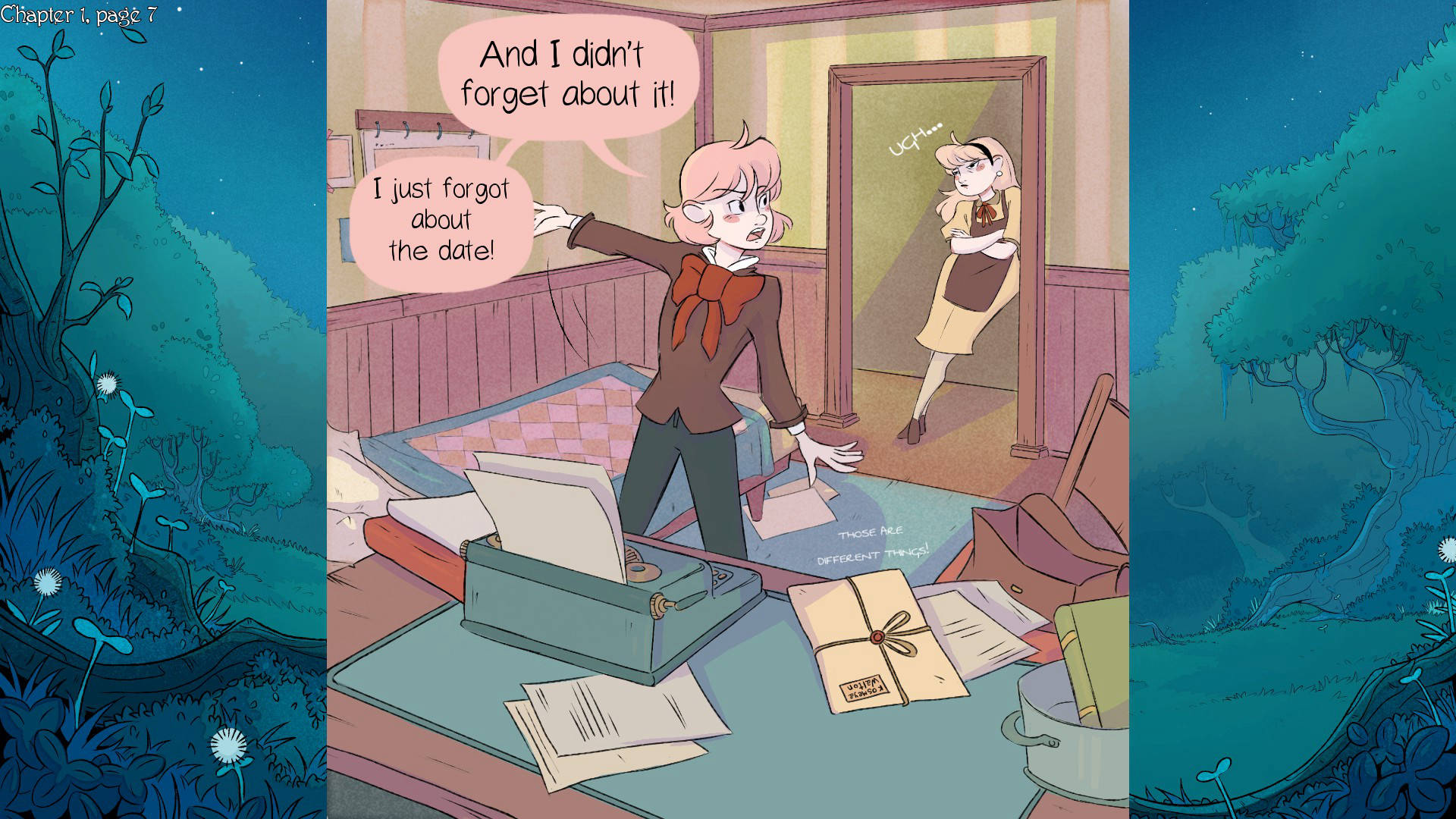 A linear visual novel that tells us about the adventures of a budding writer, Kosmeya, who needs to take his manuscript to a competition in the capital, the path to which passes through a creepy forest.